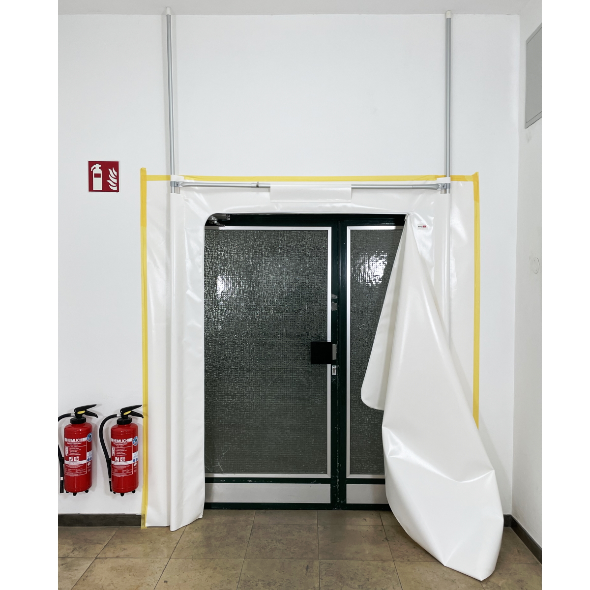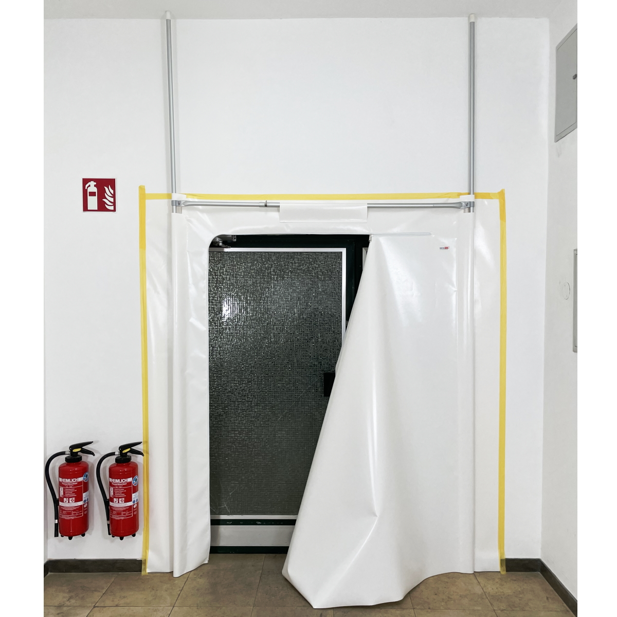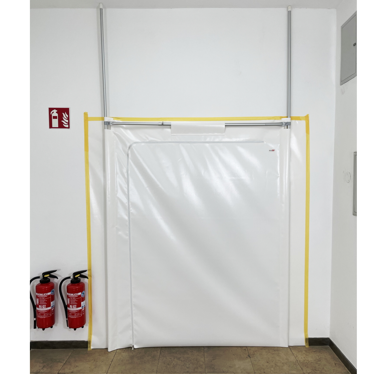 Die hochwertige easyTEC® Staubschutztür aus weißer PVC-Plane wird in Bereichen mit hoher Beanspruchung eingesetzt. In die Tür ist ein Reißverschluss in Bogenform eingenäht, der sich beidseitig öffnen läßt. Durch die Größe der Tür können auch Objekte wie Betten im Krankenhaus, Pflegebetten oder andere Transportgeräte durch die Tür geschoben werden. Teleskopstangen an der Seite und oberhalb der Tür verleihen der Reißverschlustür eine zusätzliche Stabilität.